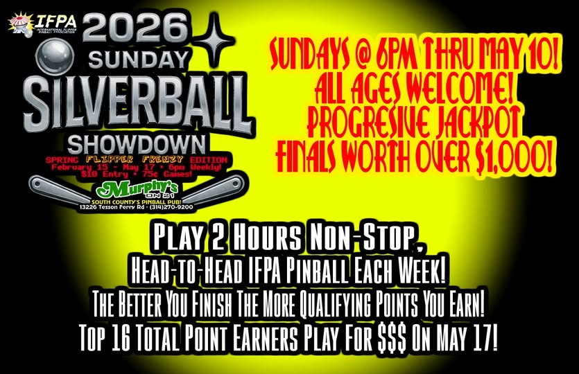 Sunday Silverball Showdown Series 2026 at Murphy’s On 21! 6pm Every Sunday Thur Mother’s Day! 13 Total Weeks of IFPA Action! $10 Entry plus Coin-Drop (75¢ Games) Each week, play a 2 hour Flipper Frenzy! Top players will go to a Matchplay finals to see who wins! Winner collects 16 points (2nd place gets 15 […]